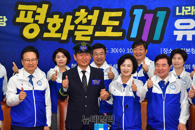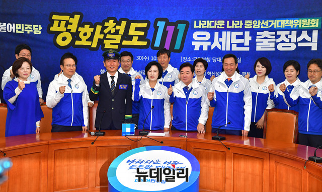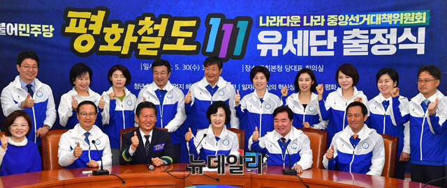 [포토] 화이팅 하는 '민주당 평화철도 111 유세단'