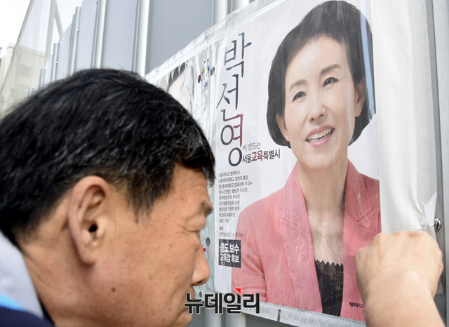 6·13 지방선거를 12일 앞둔 1일 오전 서울 중구 퇴계로에서 중구선거관리위원회 관계자들이 서울시교육감 선거후보자들의 벽보를 붙이고 있다.이번 선거에서는 총 9,299명의 후보가 등록 했으며, 광역단체장 17명, 기초단체장 226명, 광역의원 824명, 기초의원 2,927명, 교육감 17명 등 모두 4,016명이 선출된다. 12명을 뽑는 국회의원 재보선에는 46명이 후보로 등록했다.선거벽보를 훼손하면 2년 이하의 징역 또는 400만원 이하의 벌금에 처해진다.