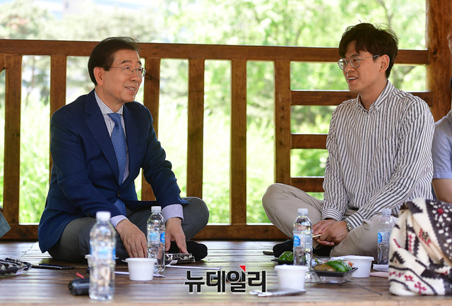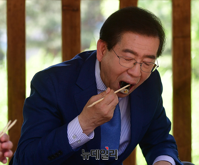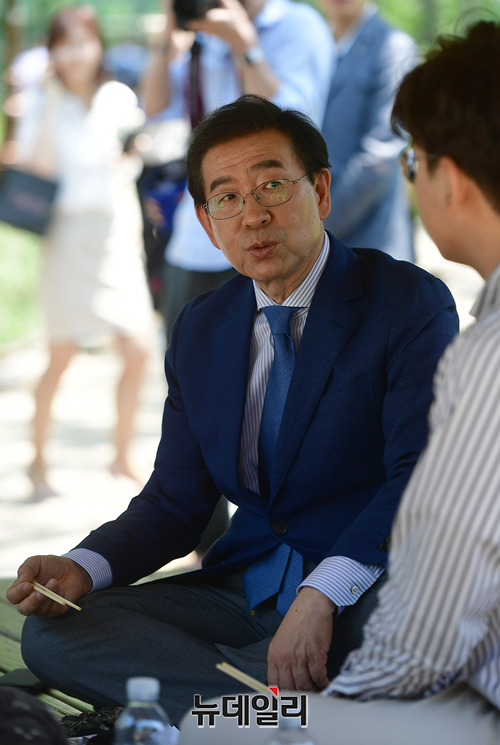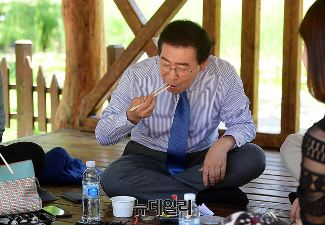 박원순 더불어민주당 서울시장 후보가 1일 오후 서울 여의도 공원에서 직장인들과 도시락을 먹으며 선거운동을 이어가고 있다.