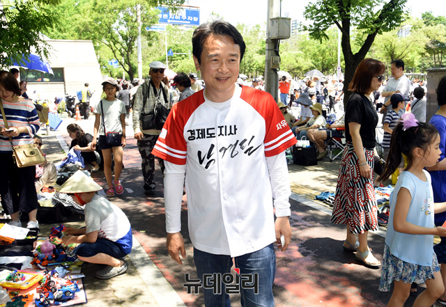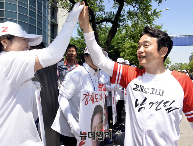 남경필 자유한국당 경기지사 후보가 2일 오후 경기 안양시 동안구 중앙공원 차 없는 거리에서 아이와 하이파이브를 하고 있다.
