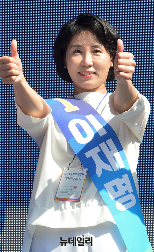 이재명 더불어민주당 경기지사 후보 내외가 2일 오후 경기 오산시 롯데마트 앞에서 첫 주말 유세를 하고 있다.