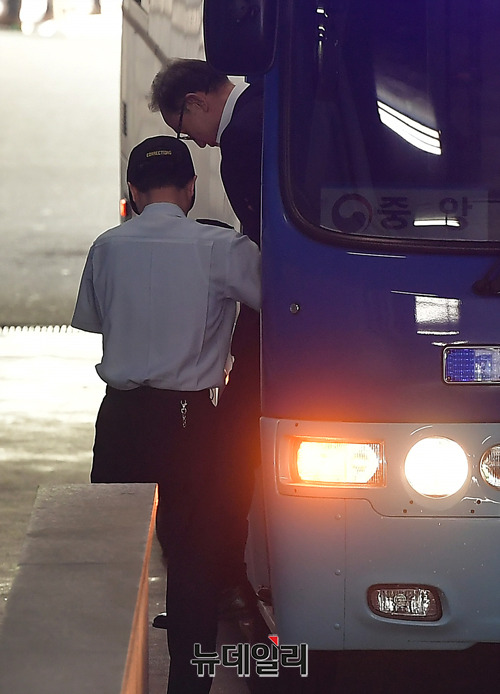 이명박 전 대통령이 4일 오전 서울중앙지법에서 열리는 제3차 공판에 참석하기 위해 호송차에서 내리고 있다.
