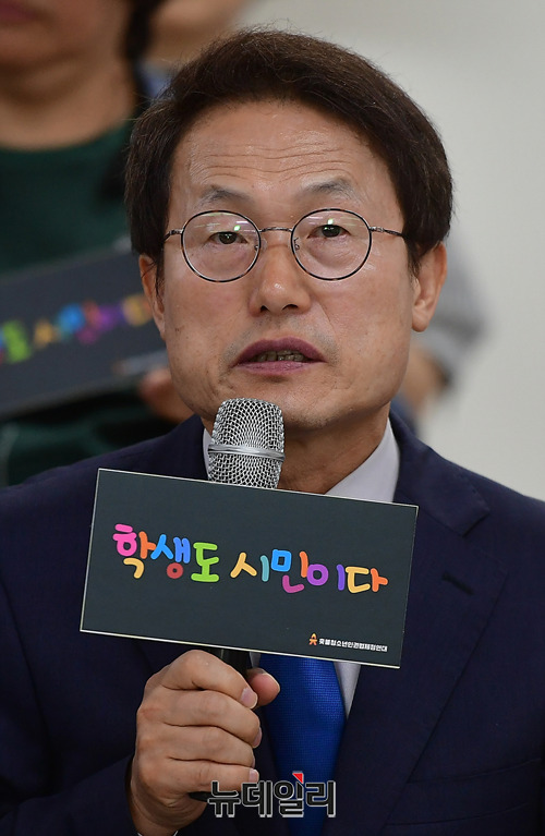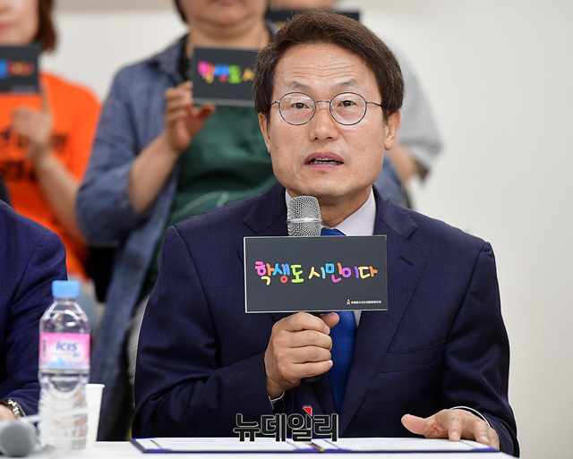 조희연 서울교육감 후보가 4일 오후 서울 중구 환경재단에서 열린 촛불청소년인권법제정연대와 정책협약식에서 참석해 발언을 하고 있다. 이날 협약식에는 송주명 경기교육감 후보, 이재정 경기교육감 후보, 김사열 대구교육감 후보, 조희연 서울교육감 후보가 참석했다.