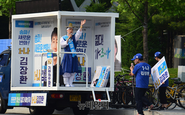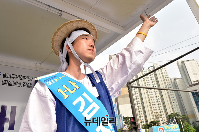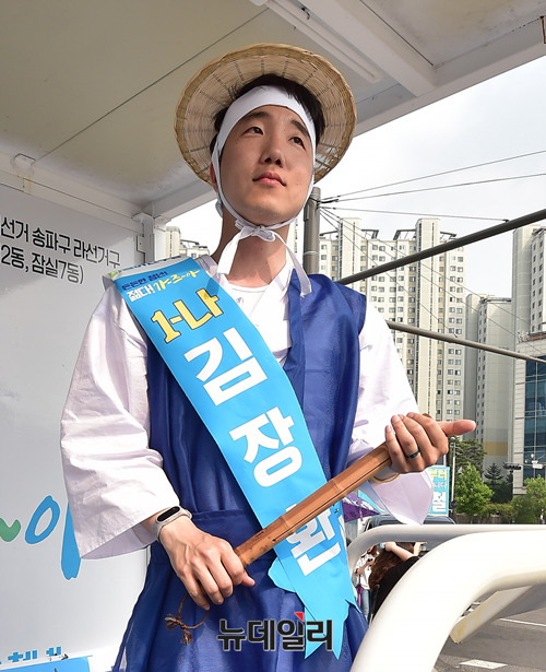 김장환 더불어민주당 서울 송파구의회의원 후보(라 선거구)가 5일 오후 서울 송파구 잠실새내역 인근에서 홍길동 복장을 하고 지지를 호소하고 있다.