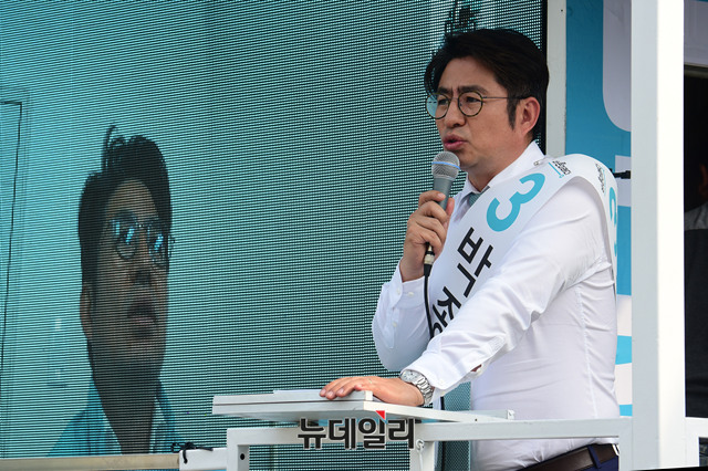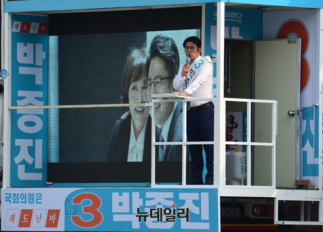 6.13 지방선거 송파을 국회의원 재보궐선거에 출마한 박종진 바른미래당 후보가 5일 오전 서울 송파구 잠실새내역 인근에서 열린 유세에서 지지를 호소하고 있다.