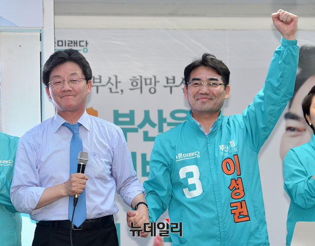 유승민 바른미래당 공동대표와 이성권 부산시장 후보가 7일 오후 부산 부산진구 쥬디스태화백화점 앞에서 지지를 호소하고 있다.