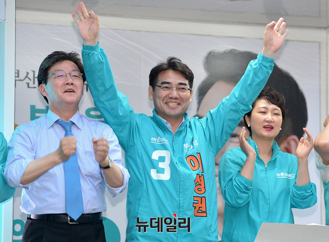 이날 유세에는 손학규 상임선대위원장, 이언주, 하태경 의원 등이 참석했다. (부산=뉴데일리 공준표 기자)