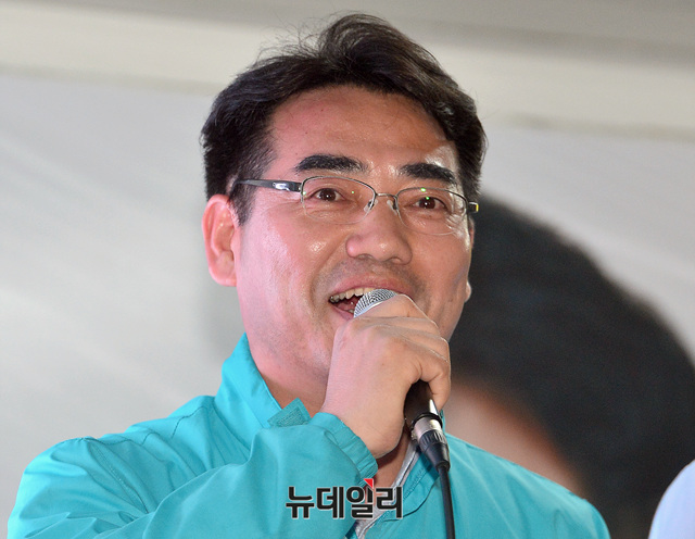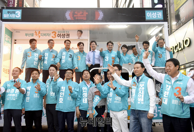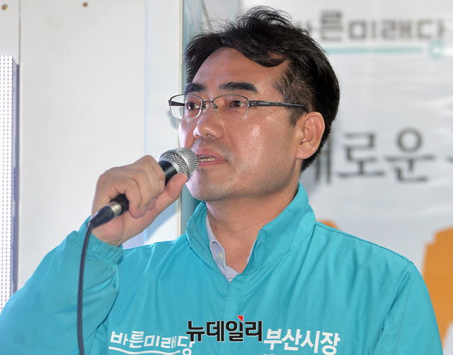 이성권 바른미래당 부산시장 후보가 7일 오후 부산 부산진구 쥬디스태화백화점 앞에서 지지를 호소하고 있다.