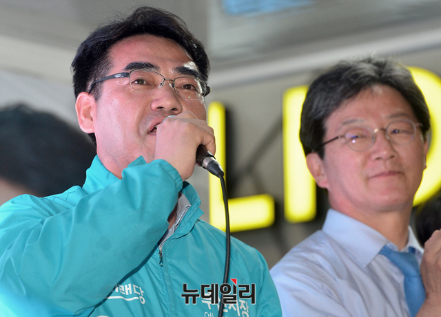 이날 유세에는 유승민 공동대표, 손학규 상임선대위원장, 하태경 의원 등이 참석했다. (부산=뉴데일리 공준표 기자)