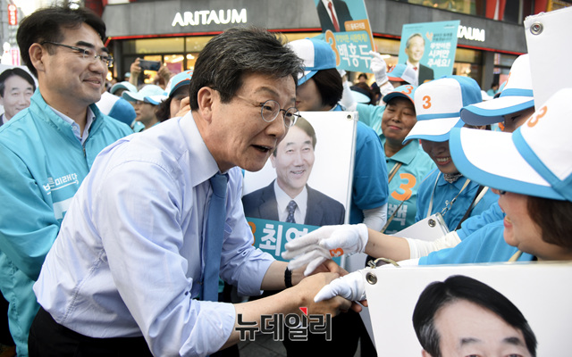 유승민 바른미래당 공동대표가 7일 오후 부산 부산진구 쥬디스태화백화점 앞에서 열린 이성권 부산시장 후보 지원 유세에 참석해 악수를 나누고 있다.
