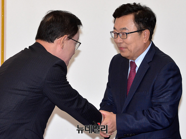 서병수 자유한국당 부산시장 후보가 8일 오전 부산 동구 부산일보 소강당에서 열린 '부산시장 후보 다자 토론회'에 참석해 악수를 나누고 있다.