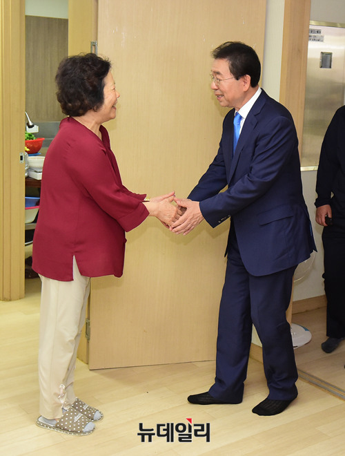 박원순 더불어민주당 서울시장 후보가 8일 오전 서울 강남 자곡로 LH강남 3단지 경로당을 찾아 어르신들에게 인사를 하고 있다.