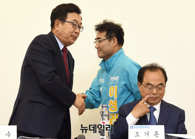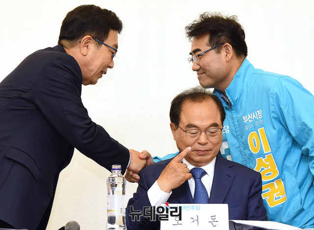 서병수 자유한국당, 이성권 바른미래당 부산시장 후보가 8일 오전 부산 동구 부산일보 소강당에서 열린 '부산시장 후보 다자 토론회'에 참석해 악수를 나누고 있다.