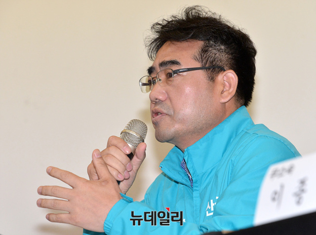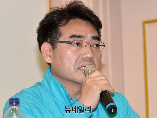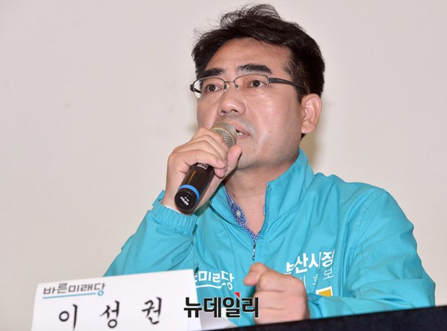 이성권 바른미래당 부산시장 후보가 8일 오전 부산 동구 부산일보 소강당에서 열린 '부산시장 후보 다자 토론회'에 참석해 발언하고 있다.