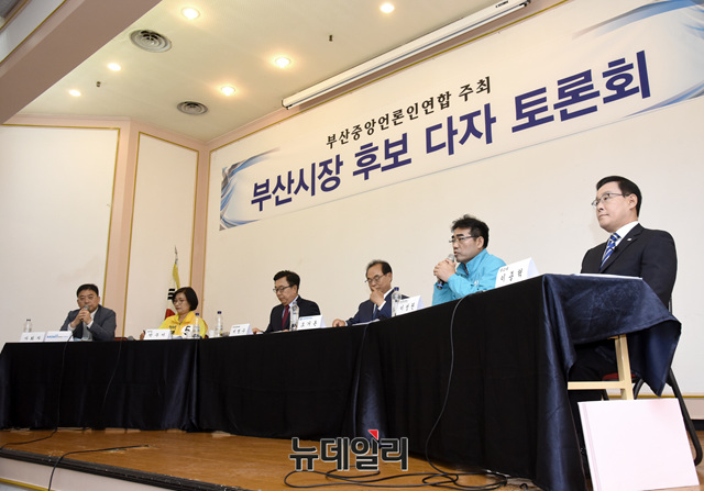 부산중앙언론인연합이 주최한 이날 토론회에는 오거돈 더불어민주당, 서병수 자유한국당, 이선권 바른미래당, 박주미 정의당, 이종혁 무소속 부산시장 후보가 참석했다. (부산=뉴데일리 공준표 기자)