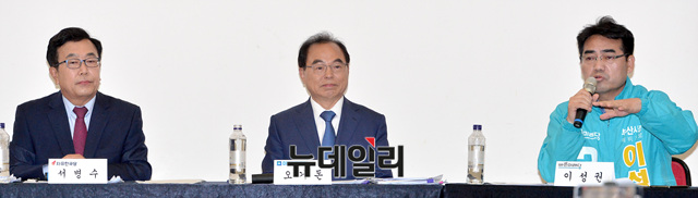 서병수 자유한국당, 오거돈 더불어민주당, 이성권 바른미래당 부산시장 후보가 8일 오전 부산 동구 부산일보 소강당에서 열린 '부산시장 후보 다자 토론회'에 참석했다.