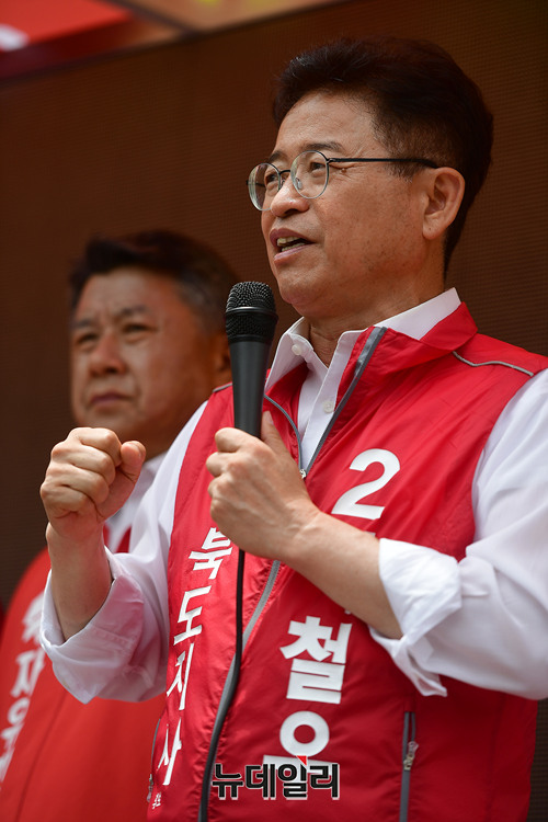 이철우 자유한국당 경북지사 후보가 사전투표 첫 날인 8일 오전 경북 구미시 금오산 공영주차장에서 열린 구미 합동유세에서 지지를 호소하고 있다. 금오산 공영주차장은 금요일마다 장터가 열리고 있다.