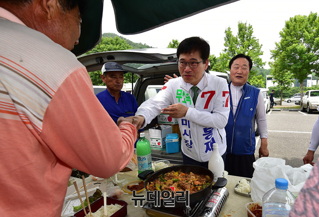 김봉재 경북 구미시장 무소속 후보가 사전투표 첫 날인 8일 오전 경북 구미시 금오산 공영주차장에서 열린 금요장터를 찾아 상인들과 악수를 나누고 있다.