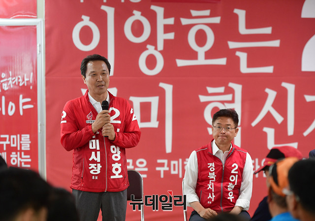 이양호 자유한국당 경북 구미시장 후보가 사전투표 첫 날인 8일 오전 경북 구미시의 본인의 선거사무실에서 사무실을 찾은 시민들에게 인사말을 하고 있다. 이 후보의 사무실에는 구미합동유세를 앞두고 이철우 경북지사 후보가 찾았다.6.13 지방선거 사전투표는 8일과 9일 양일간 오전 6시 부터 오후 6시까지 전국 사전투표소에서 진행된다. 본인임을 확인할 수 있는 신분증명서로 전국에 설치된 사전투표소에서 투표가 가능하다. (경북 구미=뉴데일리 정상윤 기자)