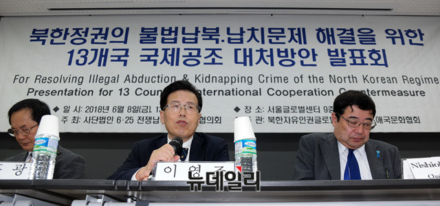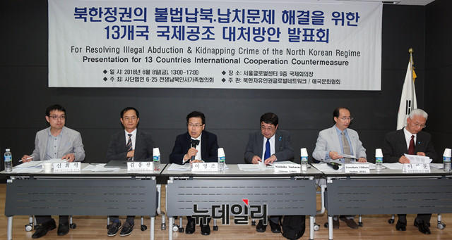 신희석 전환기정의워킹그룹 연구원, 김흥광 NK지식인연대 대표, 이영조 경희대학교 국제대학원 교수, 니시오까 쯔또무 피랍일본인구출회 회장, 토모하루 에비하라 태국 대학교수, 이희문 북한자유인권 글로벌네트워크 대표(왼쪽부터)가 8일 오후 서울 종로구 서울글로벌센터 국제회의장에서 열린 '북한정권의 불법납북·납치문제 해결을 위한 13개국 국제공조 대처방안 발표회' 행사에 참석해 자리하고 있다.이날 행사는 이미일 6.25전쟁납북인사가족협의회 이사장의 인사말과 김석우 전 통일부 차관의 축사로 시작됐다.이어 박명자 납북 탈북자, 황인철 KAL기납치피해자가족회 대표, 반종 판쵸이 태국 납북자 가족, 김남주 6.25전쟁납북인사가족협의회 이사가 납북 및 탈출 증언이 이어졌다.