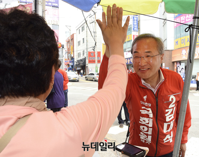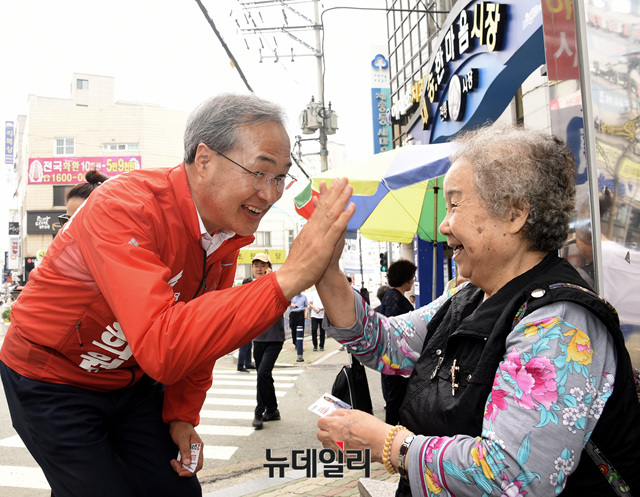 김대식 자유한국당 부산 해운대구을 국회의원 보궐선거 후보가 8일 오후 부산 해운대구 재송한마음시장을 찾아 상인들과 하이파이브를 하고 있다. (부산=뉴데일리 공준표 기자)