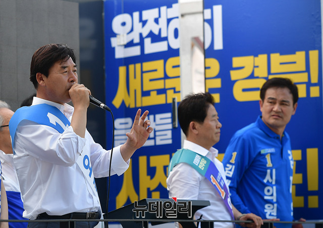 오중기 더불어민주당 경북지사 후보가 사전투표 첫 날인 8일 오후 경북 구미역 광장을 찾아 선거유세를 이어가고 있다.