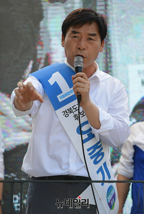 오중기 더불어민주당 경북지사 후보가 사전투표 첫 날인 8일 오후 경북 구미역 광장을 찾아 지지를 호소하고 있다.