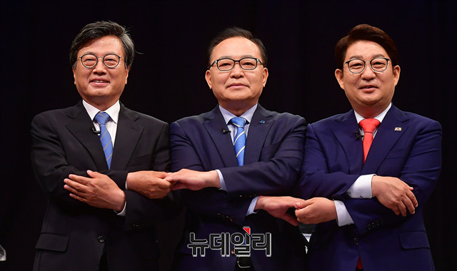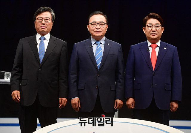 대구광역시장 김형기 바른미래당 후보, 임대윤 더불어민주당 후보, 권영진 자유한국당 후보(왼쪽부터)가 8일 오후 대구 수성구 TBC 방송국에서 토론회에 앞서 기념촬영을 하고 있다. 이날 대구시장 후보 토론회는 선거 기간중 마지막 토론회로 오후 6시 20분 부터 8시까지 TBC를 통해 생중계 된다.