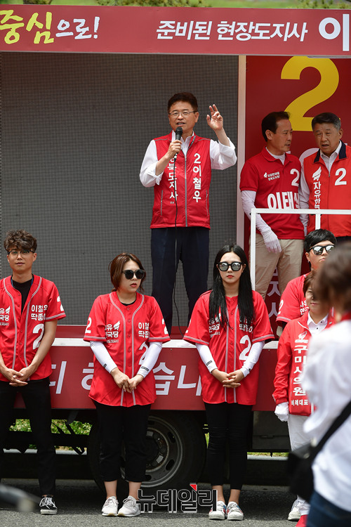 이철우 자유한국당 경북지사 후보가 사전투표 첫 날인 8일 오전 경북 구미시 금오산 공영주차장에서 열린 구미합동유세에서 이양호 구미시장 후보와 함께 자율형 전기차를 타고 있다.
