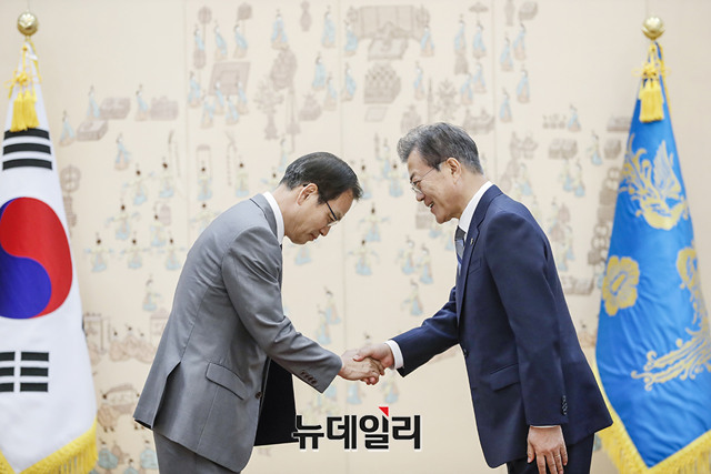 문재인 대통령이 8일 오후 청와대 접견실에서 드루킹 게이트를 조사할 임무를 맡은 허익범 특별검사에게 임명장을 수여하고 있다. (사진=청와대)