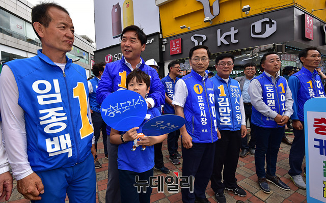 오중기 더불어민주당 경북지사 후보, 허대만 포항시장 후보(왼쪽부터)가 사전투표 마지막 날인 9일 오후 경북 포항시 북포항우체국에서 열린 합동유세에서 지원 유세에 나선 추미애 당대표를 기다리고 있다. (경북 포항=뉴데일리 정상윤 기자)