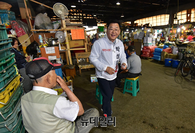 박성효 자유한국당 대전시장 후보가 지방선거를 이틀 앞둔 11일 오전 대전 동구 중앙시장을 방문해 상인들에게 명함을 나눠주며 유세를 이어가고 있다. (대전=뉴데일리 정상윤 기자)