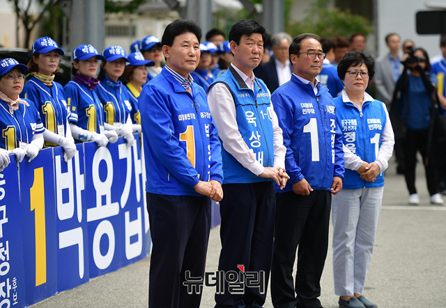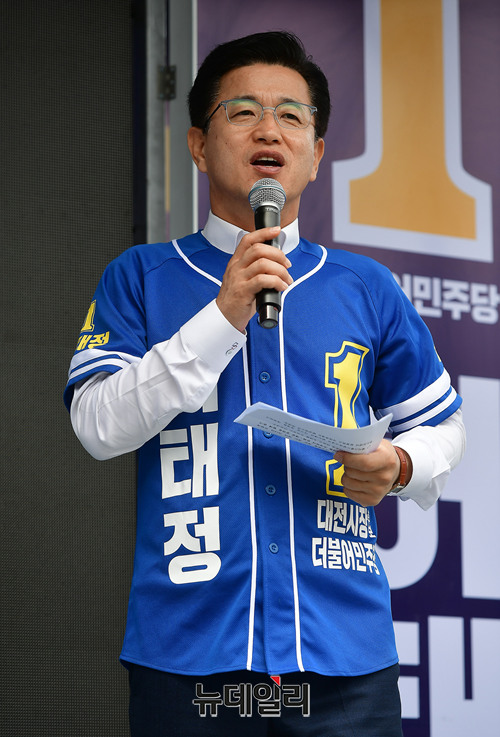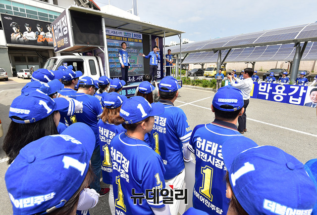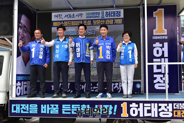 허태정 더불어민주당 대전시장 후보가 지방선거를 이틀 앞둔 11일 오전 대전 중구 한밭종합운동장 입구에서 비전발표 직후 같은 당 후보, 지지자, 선거원들과 기념촬영을 하고 있다. (대전=뉴데일리 정상윤 기자)