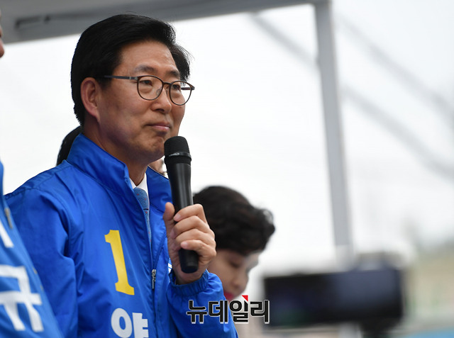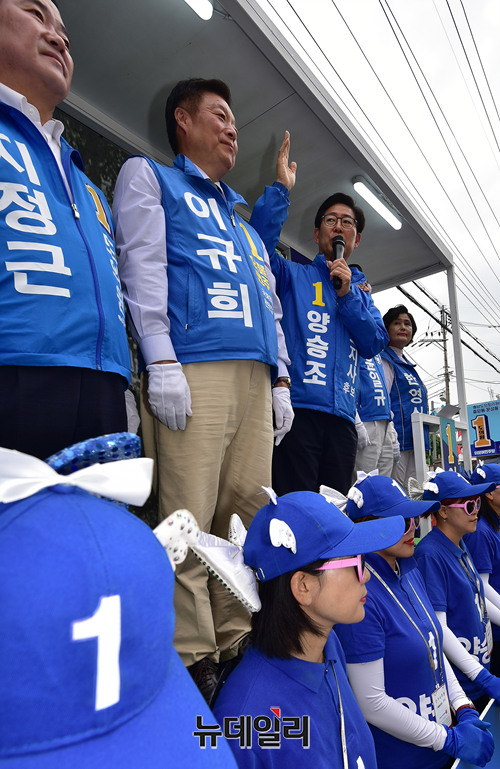양승조 더불어민주당 충남지사 후보가 지방선거를 이틀 앞둔 11일 오후 충남 천안시 동남구 천안중앙시장 입구에서 열린 합동 유세에서 시민들에게 지지를 호소하고 있다. (충남 천안=뉴데일리 정상윤 기자)
