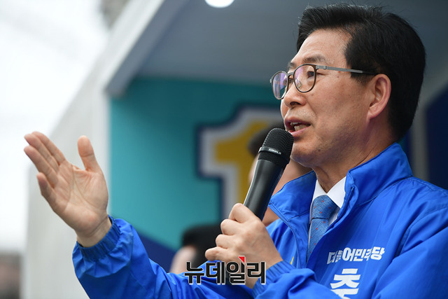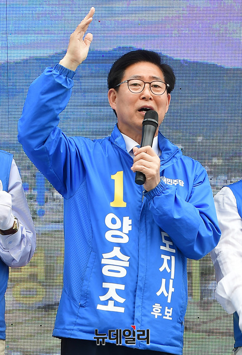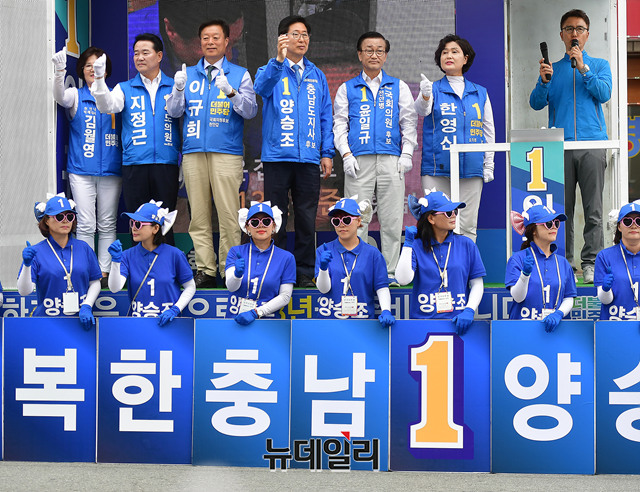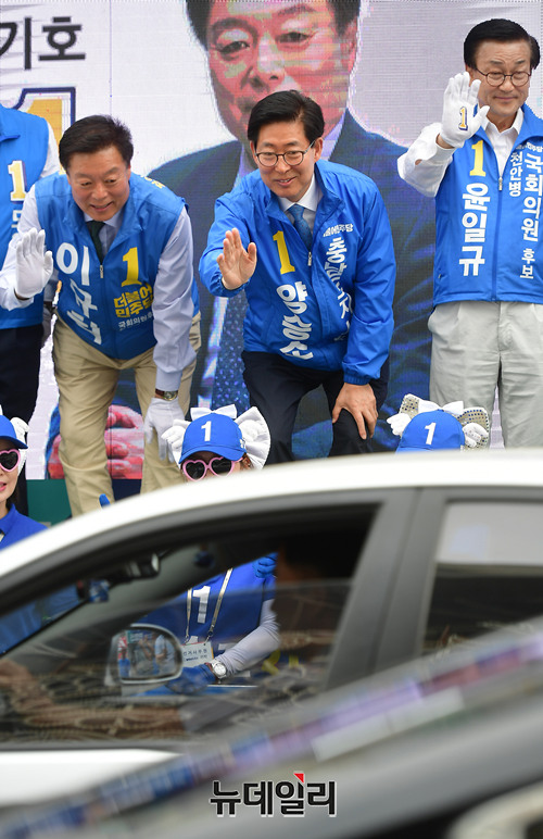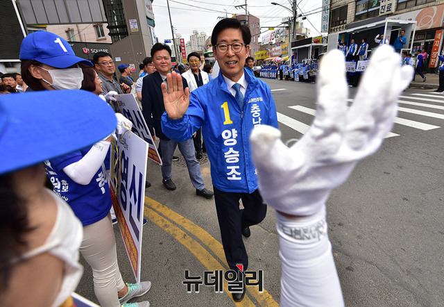 양승조 더불어민주당 충남지사 후보가 지방선거를 이틀 앞둔 11일 오후 충남 천안시 동남구 천안중앙시장 입구에서 열린 합동 유세에서 시민들에게 손을 흔들며 화답하고 있다. (충남 천안=뉴데일리 정상윤 기자)
