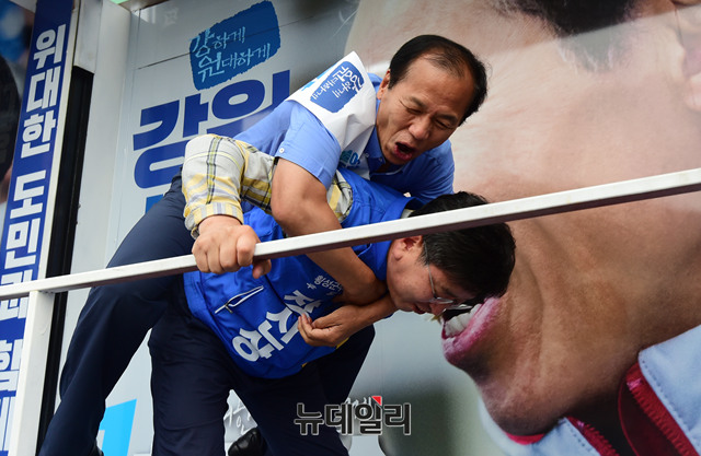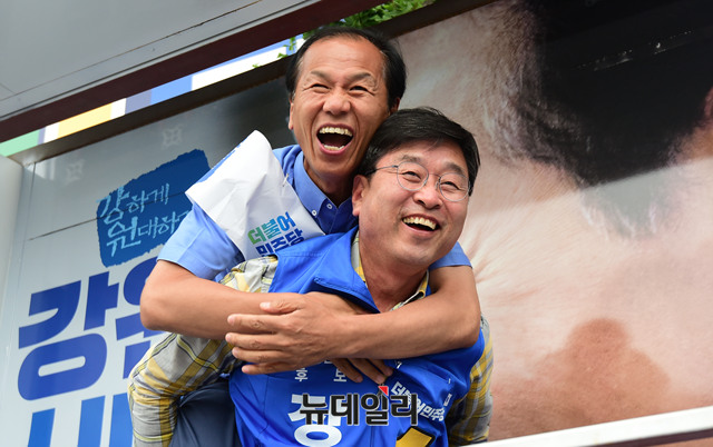 최문순 더불어민주당 강원도지사 후보가 지방선거를 2일 앞둔 11일 오후 강원 횡성군 횡성시장 인근에서 열린 유세에서 장신상 횡성군수 후보 등에 업혀있다. (강원 횡성=뉴데일리 이종현 기자)