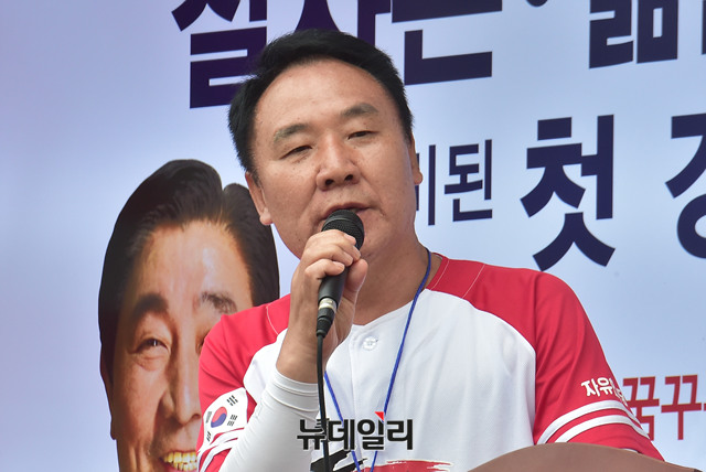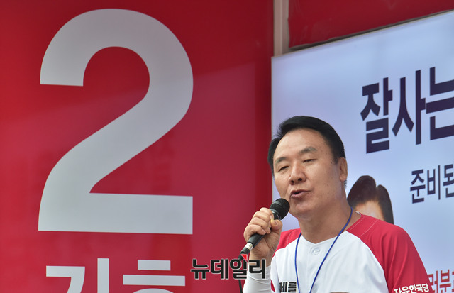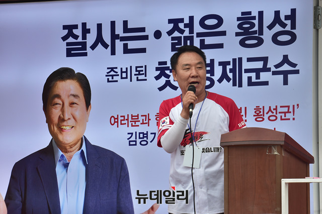 염동열 자유한국당 의원이 지방선거를 2일 앞둔 11일 오후 강원 횡성군 횡성시장 인근에서 횡성군수 후보로 출마한 김명기 후보 지원유세를 하고 있다. (강원 횡성=뉴데일리 이종현 기자)