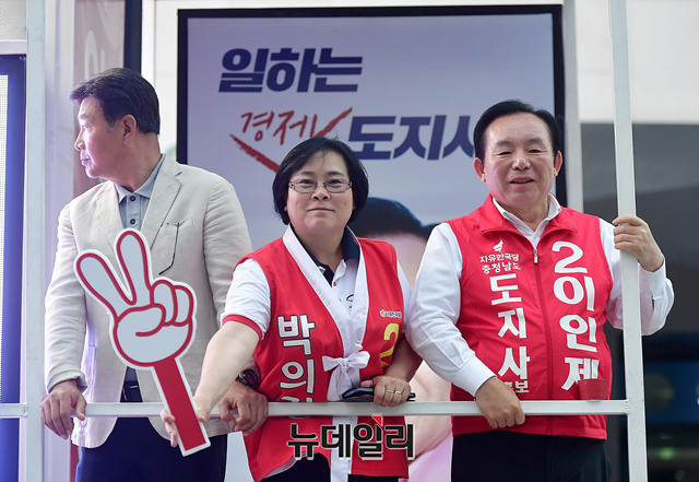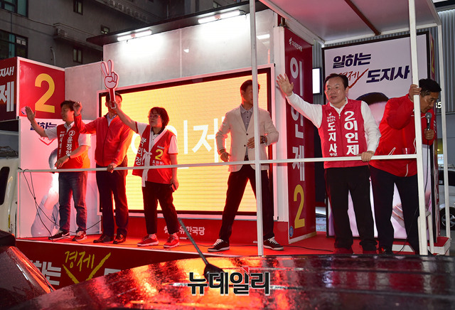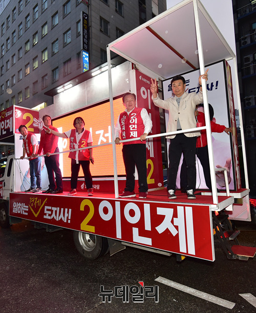 이인제 자유한국당 충남지사 후보가 지방선거가 이틀 남은 11일 오후 충남 천안시 서북구의 번화가를 유세차에 올라 지지를 호소하고 있다. 이날 유세는 배우 길용우가 차량에 함께 올라 이 후보를 도왔다. (충남 천안=뉴데일리 정상윤 기자)