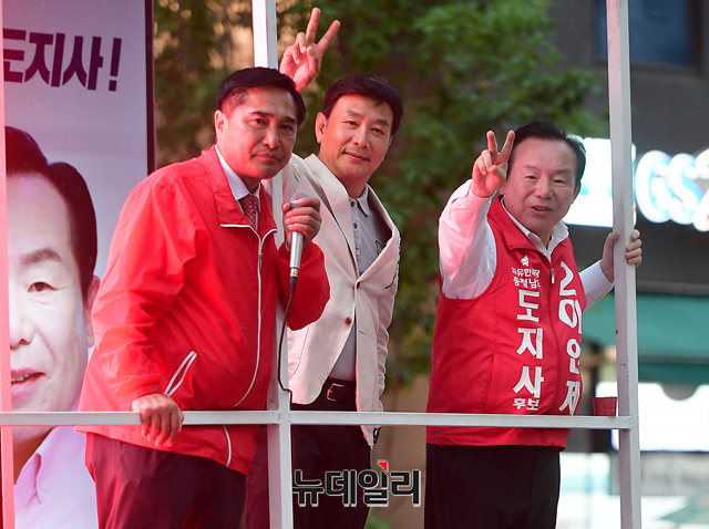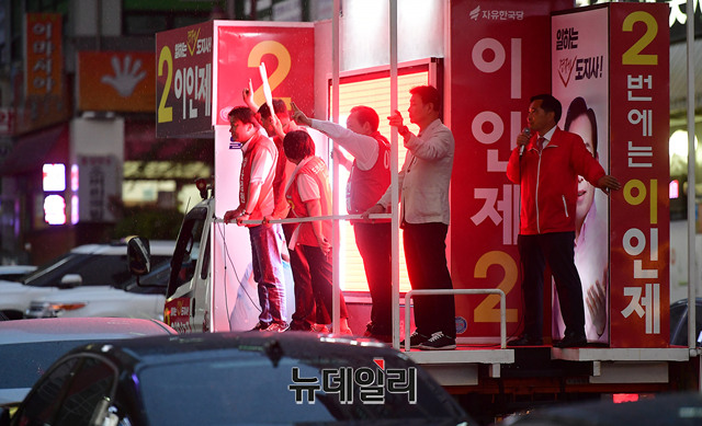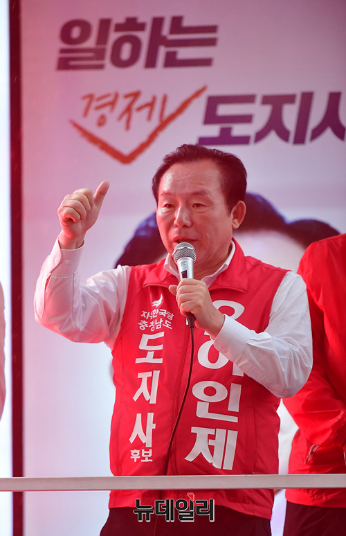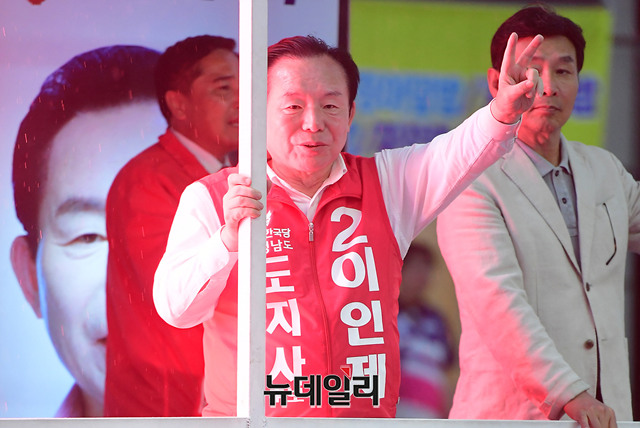 이인제 자유한국당 충남지사 후보가 11일 오후 충남 천안시 서북구의 번화가 일대를 유세차에 올라 지지를 호소하고 있다. 이날 유세는 배우 길용우 씨가 차량에 함께 올라 이 후보를 도왔다. (충남 천안=뉴데일리 정상윤 기자)
