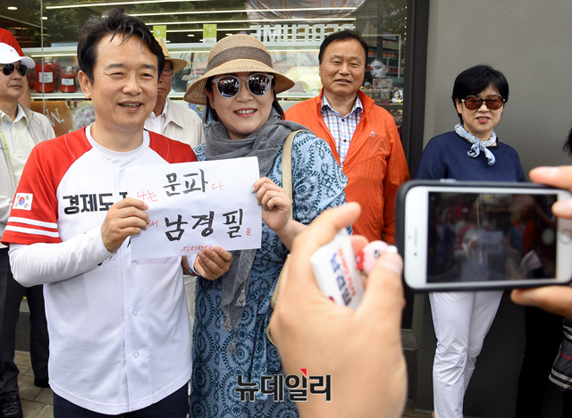 남경필 자유한국당 경기지사 후보와 한 지지자가 12일 오후 경기 평택시 서정리역 앞에서 "나는 문파(문재인 지지자)다 그래서 남경필 지지한다"고 적힌 종이를 들고 기념 촬영을 하고 있다. (경기 평택=뉴데일리 공준표 기자)