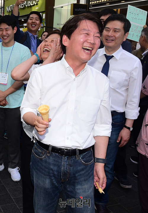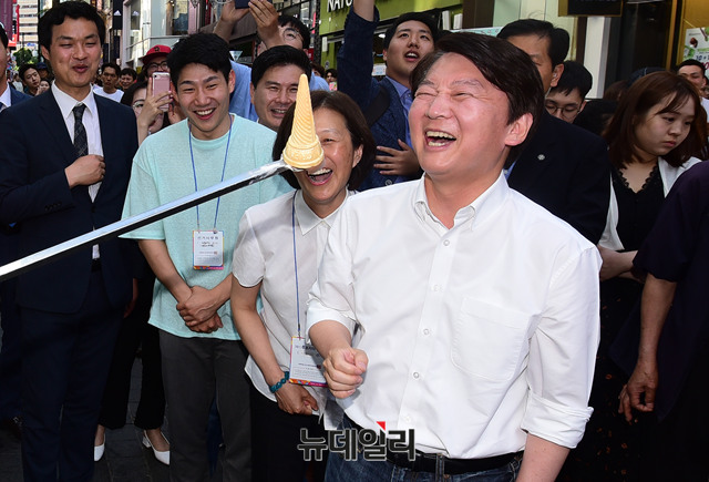 안철수 바른미래당 서울시장 후보와 부인 김미경 교수가 6.13 지방선거를 하루 앞둔 12일 오후 서울 중구 명동 일대서 지지를 호소하던 중 아이스크림 판매원의 장난에 활짝 웃고 있다.