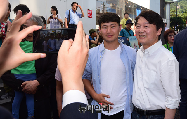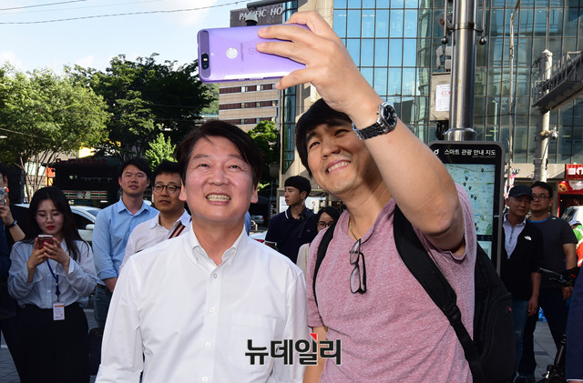 안철수 바른미래당 서울시장 후보가 6.13 지방선거를 하루 앞둔 12일 오후 서울 중구 명동 일대서 시민들을 만나 사진을 찍고 있다.