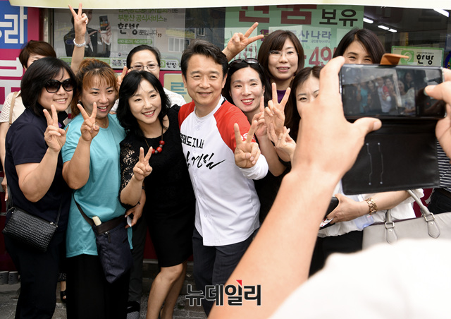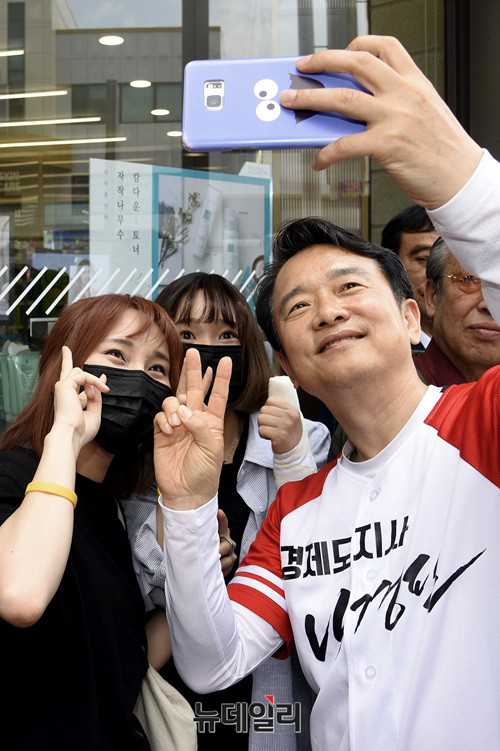 남경필 자유한국당 경기지사 후보와 시민들이 12일 오후 경기 평택시 서정리역 앞에서 기념 촬영을 하고 있다. (경기 평택=뉴데일리 공준표 기자)