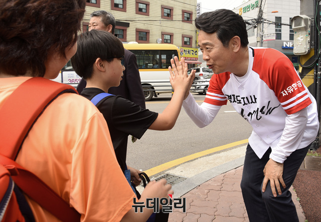 남경필 자유한국당 경기지사 후보가 12일 오후 경기 화성시 병점사거리에서 아이들과 하이파이브를 나누고 있다. (경기 화성=뉴데일리 공준표 기자)