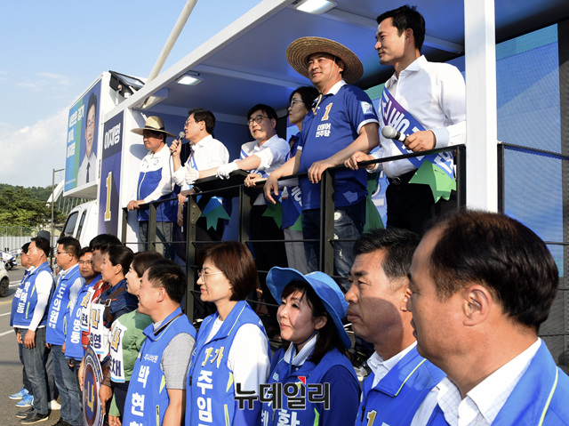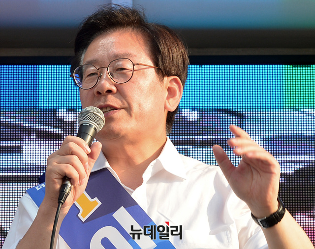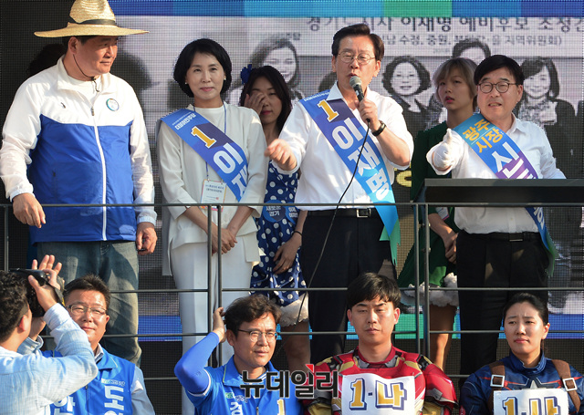 이재명 더불어민주당 경기지사 후보가 12일 오후 경기 광주시 광주역 앞에서 지지를 호소하고 있다. (경기 광주=뉴데일리 공준표 기자)