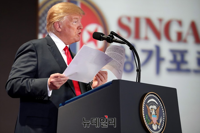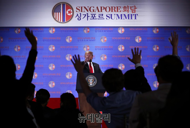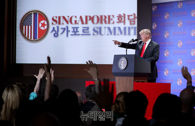 도널드 트럼프(Donald Trump) 미국 대통령이 12일 오후 싱가포르 카펠라 호텔에서 김정은과의 첫 정상회담을 마친 후 가진 기자회견에서 질문에 답변하고 있다. (사진=싱가포르 통신정보부)
