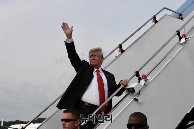 도널드 트럼프(Donald Trump) 미국 대통령이 12일 오후(현지시간) 싱가포르 파야 레바르 공군기지에서 에어포스원(Air Force One)에 탑승하며 손을 흔들고 있다. (사진=싱가포르 통신정보부)