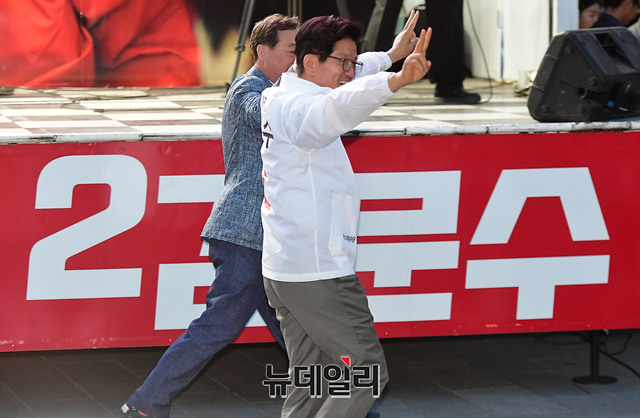 김문수 자유한국당 서울시장 후보의 지지자들이 지방선거를 하루 앞둔 11일 오후 서울 대한문 앞에서 열린 마지막 총력 유세에 선전물을 들고 김 후보를 기다리고 있다.