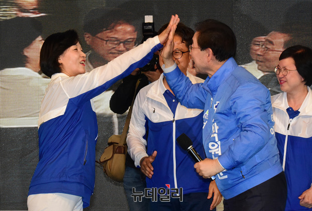 박원순 더불어민주당 서울시장 후보와 추미애 대표가 6.13 지방선거를 하루 앞둔 12일 오후 서울 중구 명동에서 열린 집중유세에서 하트를 만들고 있다.