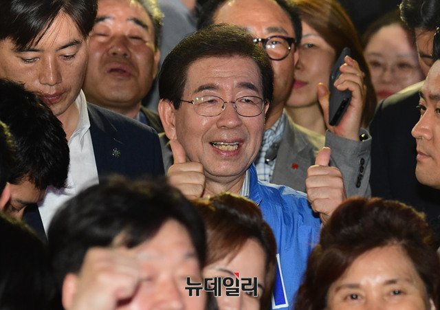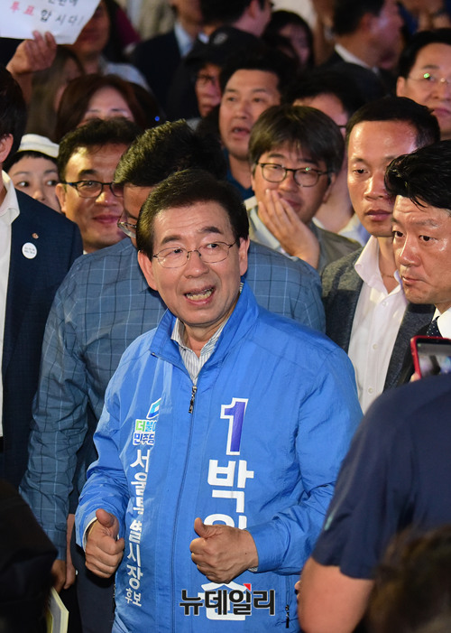박원순 더불어민주당 서울시장 후보가 6.13 지방선거를 하루 앞둔 12일 오후 서울 중구 명동에서 열린 집중유세에서 지지자들에게 인사를 하고 있다.